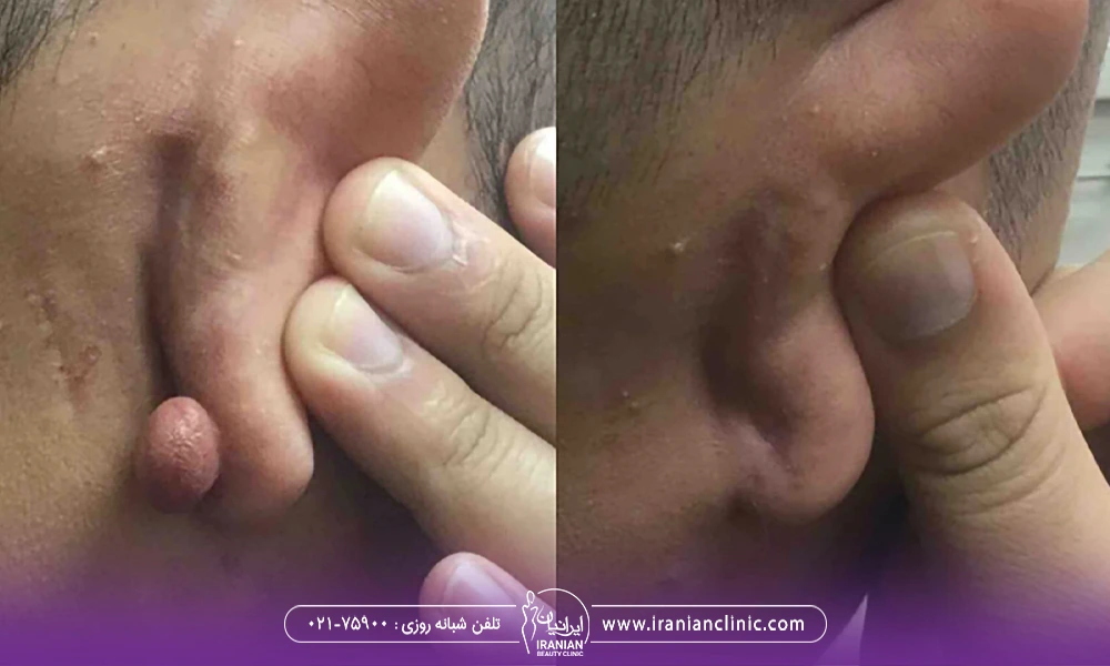 - برجستگی نرم یا سفت در محل زخم یا سوراخ گوش